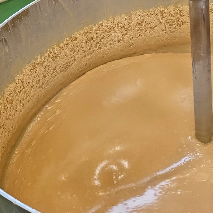 なめらかな口当たりにするために、抹茶はふるい、水あめの中に少しずつ手作業で攪拌。鮮やかな緑色と香りをいかすため、抹茶は仕上げ直前に混ぜ合わせ、クリーミーな硬さになるまで時間をかけて濃縮しました。