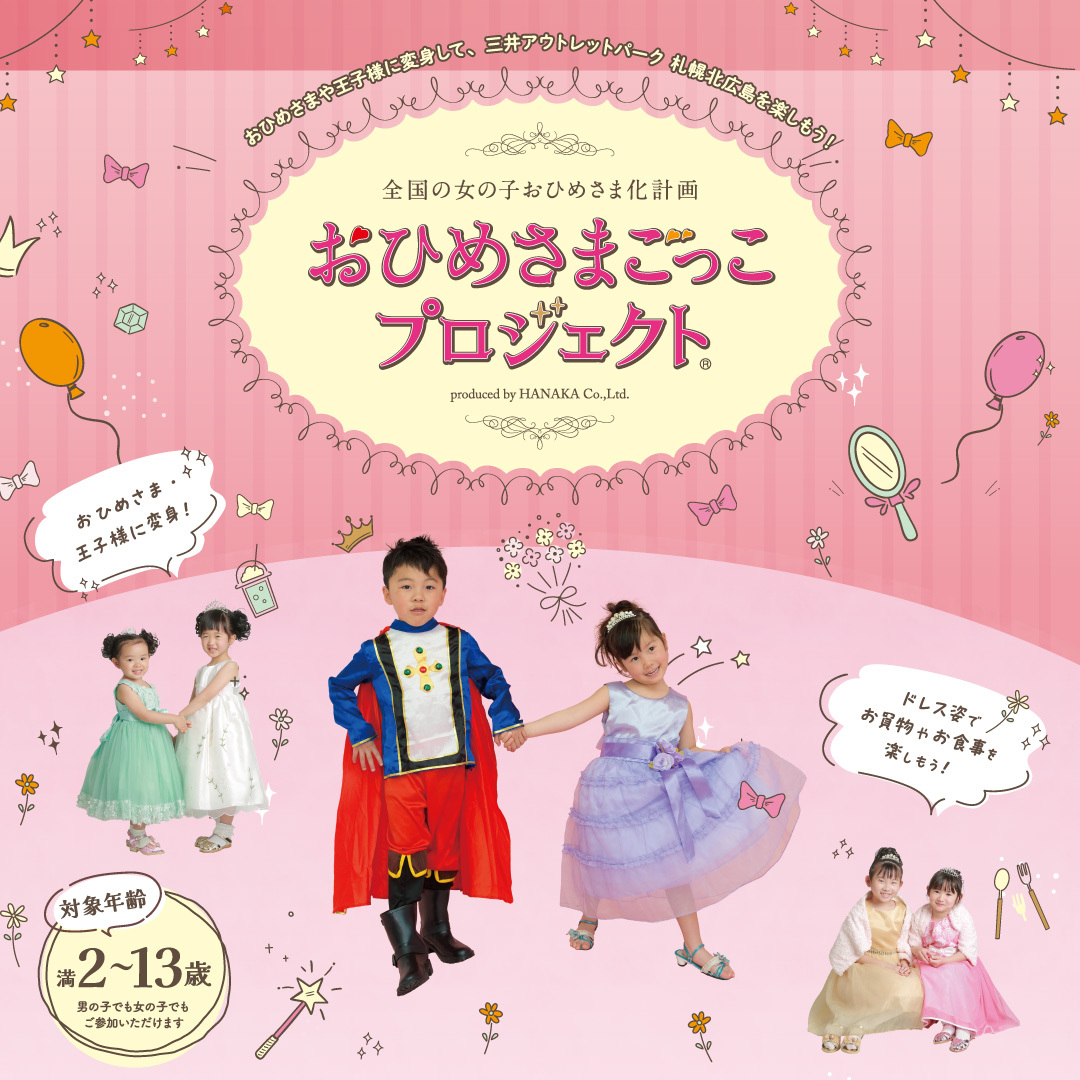 誰もが憧れた「おひめさま」・「おうじさま」の好きな衣装に着替えて、三井アウトレットパーク 札幌北広島館内で変身して自由に過ごすことができます