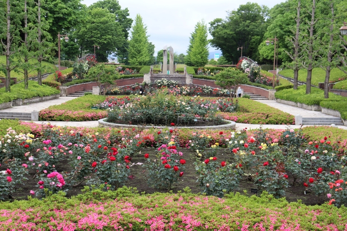 レンガと大理石を使った東欧風のバラ園は、約110種類450株の色とりどりのバラが咲く園内の人気スポットのひとつです。