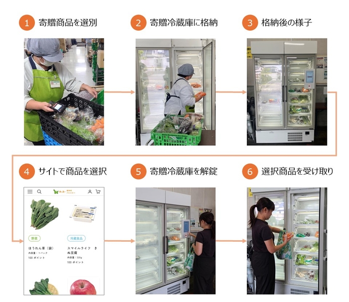 受け取り参加の団体・個人の方は、専用のマッチングサイトから商品を選択し、付与されるポイントを使って決済します(無償)。その後、当日中に店舗に訪問し、受け渡し冷蔵庫を解錠して、自分が選択した商品を持ち帰っていただきます。