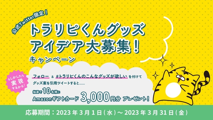 当社公式Twitterアカウントをフォロー&当社のTwitterキャンペーンに関するツイートから「#トラリピくんのこんなグッズが欲しい」を付けてグッズ案を記入して引用ツイートされた方の中から、抽選で10名様にAmazonギフトカード3,000円分をプレゼントいたします。
