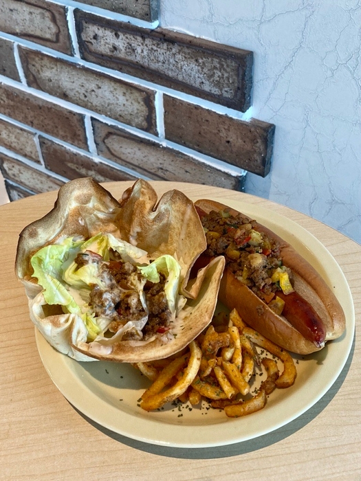 コニードッグ、22cmのトルティーヤ生地でサラダを包んだタコス。サイドには人気のカーリーフライを盛り付けた一皿。