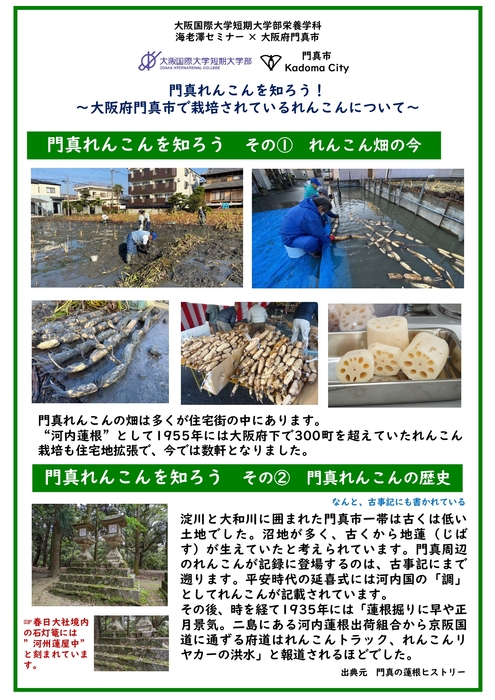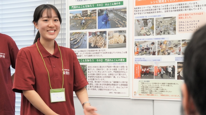 海老澤セミナーでは大学近隣の農産物である門真市の伝統野菜である「門真れんこん」の活用やキッチンサイエンスについて研究しています。また、栄養学科では地域共催イベントの実施をはじめ、近隣自治体での様々な食育イベントに参加しています。食と栄養の専門職である栄養士養成機関として、”食”をとおした地域社会とのつながりについて、発表しました。