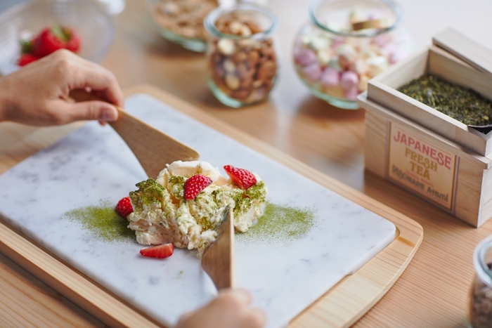 ミルクジェラートと新茶パウダー、いちごやホワイトチョコなどのトッピングを、冷たいプレートの上に載せ、ヘラを使って混ぜます。混ぜ終わったらカップに入れて完成です。新茶の爽やかな風味とミルクジェラートのまろやかさは相性ぴったりです。茶葉の量は好みによって調整することができます。自分好みにトッピングを入れたり、お互いに作り合ったり、全員でプレートを囲んでパーティー気分で楽しめます。