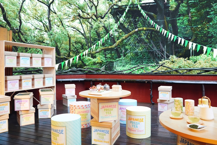3 茶箱を使用したテーブルや茶筒をモチーフしたイスが揃う、新茶を楽しむ空間
