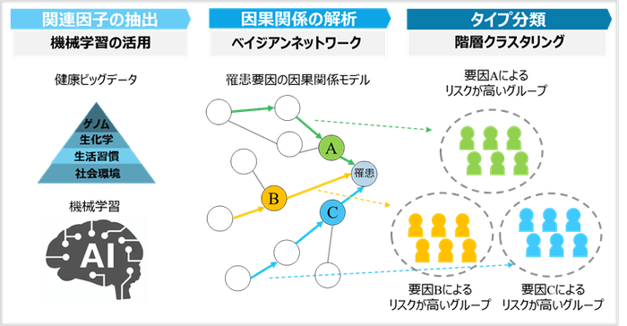しかしながら、健康ビッグデータ解析による病気の罹患リスクの高い特徴の特定にあたり、今回用いるデータが約3000項目×数千、数万人と膨大なデータ量となるため、一般的な相関解析やクラスタリング手法を適用するだけでは罹患リスクの特徴の抽出や、その関係性の把握が困難でした。