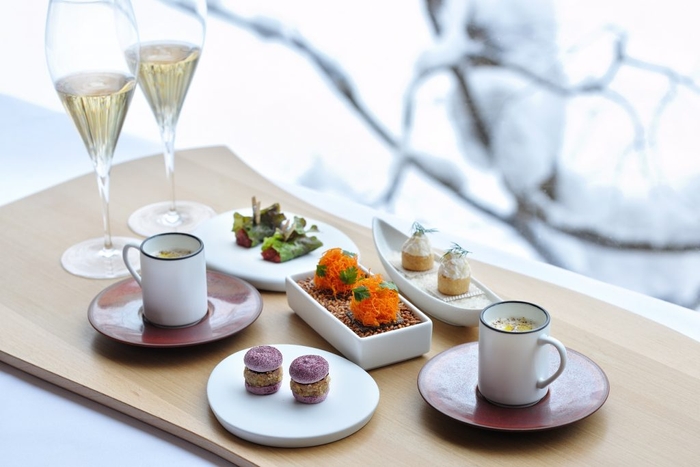 冬の「渓流アペロ」で提供するのは、冬らしい食材を用いた、5品のアミューズです。繊細な仕立てのアミューズを口に含むと、幾つもの味わいと食感が重なり、驚きと感動が広がります。さらに、アミューズの味わいを深めるシャンパーニュを、ソムリエがワインセラーに貯蔵した約150種類の銘醸ワインの中から厳選しました。アミューズとシャンパーニュの奥深いマリアージュを楽しみながら、渓流の瀬音に耳を傾ける時間は、この上ない贅沢です。
