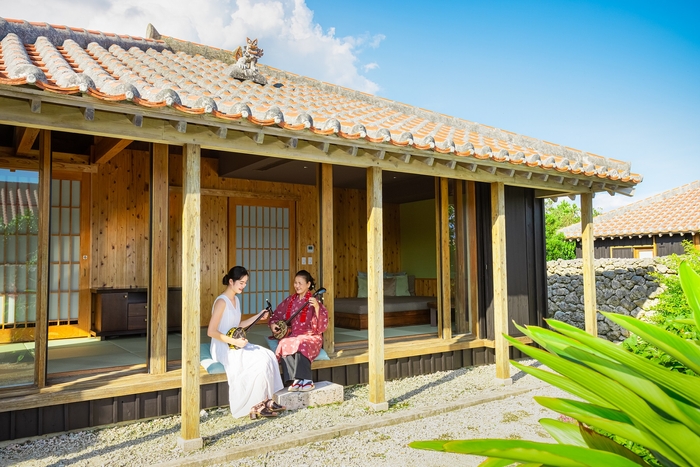 島の伝統建築を踏襲した客室で演者に三線を教わります。基本的な弾き方や三線の楽譜「工工四(くんくんしー)」の読み方を習った後は、竹富島の民謡「安里屋ユンタ」を練習します。安里屋ユンタとは、竹富島を舞台にした島で親しみの深い民謡です。三線の音色の心地よさを感じながらも、三線の練習に没頭できます。