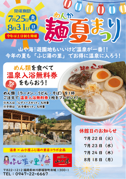 『九州筑豊ラーメン』ブランドのチェーン展開や食材の卸売りをおこなうワイエスフード株式会社(本社:福岡県田川郡香春町鏡山552-8/代表取締役社長 高田 十光 以下、当社)は、当社が運営する今年で創業55周年を迎える「九州筑豊ラーメン山小屋」と2020年6月より指定管理者として運営しております「ほうじょう温泉 ふじ湯の里(以下、ふじ湯の里)」(福岡・福智町)で、夏休みの思い出づくり応援企画として『麺夏(めんか)まつり2025』を開催いたします。