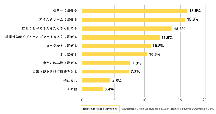 薬を飲ませるための工夫として多かったのは、「ゼリーに混ぜる」「アイスクリームに混ぜる」など、子どもの好きな甘い食品に混ぜる方法でした。次いで、「飲めたらたくさんほめる」「薬を飲んだらご褒美にアイスを食べる」といった、子どものやる気を刺激する方法も見られました。