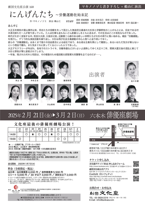 劇団文化座公演168『にんげんたち~労働運動社始末記』が2025年2月21日 (金) 〜 2025年3月2日 (日)に俳優座劇場(東京都 港区 六本木 4-9-2)にて上演されます。