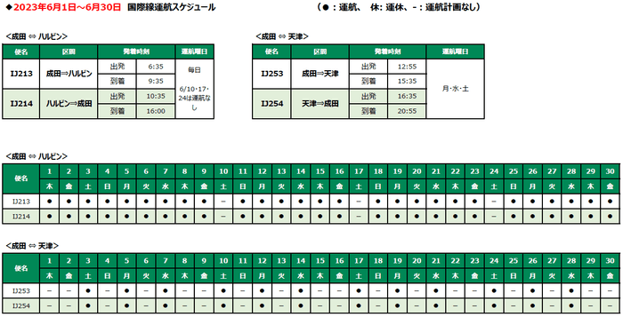 ◆成田=ハルビン線 夏ダイヤ増便スケジュール (2023年5月25日~6月29日)