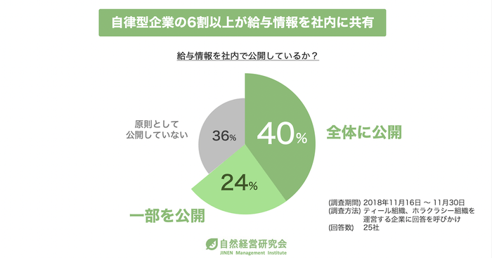 自然経営研究会が「ティール組織の組織運営実態調査」を実施、 話題のホラクラシー企業5社が調査協力を呼びかけ 回答企業25社の64%が給与情報を社内公開していることが明らかに