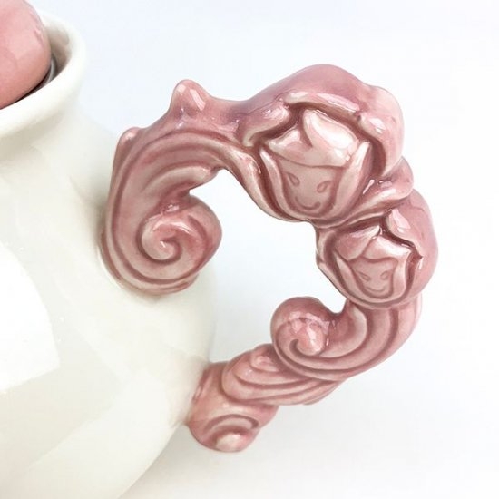 ピンクと白の配色もかわいい、磁器製のティーポット。中央にはアリスのキュートなデザインが施されています。