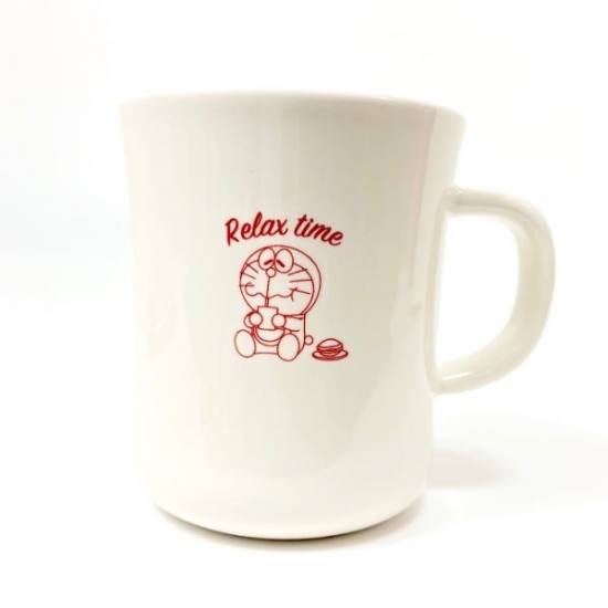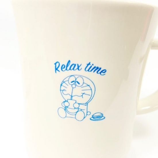こちらは、どら焼きを食べるリラックスタイムのドラえもんがかわいい、マグカップです。まったりした表情がかわいくて、人気のデザインですよ。