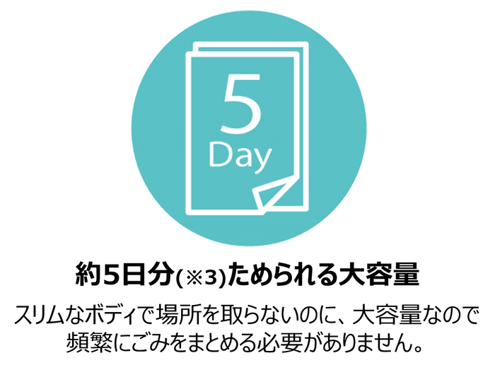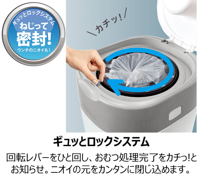 本製品は、紙おむつを1つ1つねじって密封する特許取得構造で、フタを開けても臭いません(※2)。また、約5日分(※3)の紙おむつをためられるので、まとめて捨てることができます。さらに、カセットは99%抗菌(※4)フィルムを使用しているので、菌の繁殖を抑制します。