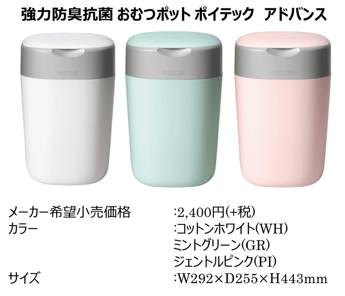 コンビ株式会社は、ねじって密封するからフタを開けても臭わない(※2)おむつポット「強力防臭抗菌 おむつポット ポイテック アドバンス」を2019年8月上旬より、全国のGMSやベビー用品専門店などで販売いたします。