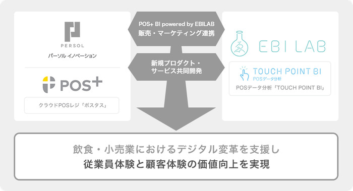 店舗のDX支援として「BI(Business Intelligence=店舗を見える化すること)」は重要なポイントであり、POSレジとの親和性が高い分野であると考え、ポスタス社とEBILAB社では、2020年2月に「TOUCH POINT BI」と「POS+」におけるサービス連携を行い、「POS+BI powered by EBILAB」として販売を開始しております※3。今後は一層の連携強化を図り、両社の持つ顧客接点を活かしながら、2022年末までに1万店舗での導入を目指してまいります。さらに、マーケティング連携のほか、EBILAB社の企画・開発力とパーソルグループの持つアセットを活かした新サービスや飲食・小売事業者のためのデジタルソリューションの企画開発などを共同で行ってまいります。