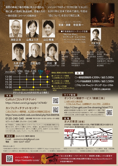 メメントCでは嶽本あゆ美のオリジナル作品ともう一つの柱として、チェーホフ作品の上演を重ねてきました。2011年には「ともしび」の日本初演、第六病棟も新しい解釈と秀逸な脚本で注目を浴びました。チェーホフの小説は戯曲とまた違った哲学に満ちています。