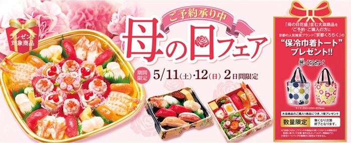 小僧寿しの母の日フェアでは、「母の日 花盛」を含む、大皿商品をご予約・ご購入の方に人気雑貨ブランド「京都くろちく」の保冷巾着トートを、先着限定数でご用意!