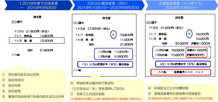 現行の「区分記載請求書」に「登録番号」、「適用税率」及び「消費税額等」の記載が追加された書類やデータをインボイスといいます。