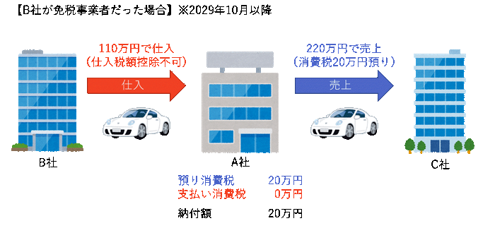 先ほどの例で表すと2029年10月以降、B社が免税事業者だった場合は下記のように10万円の仕入税額控除ができず、A社の納付額としては20万円となります。