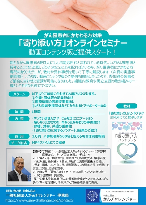 一般社団法人がんチャレンジャー(所在地:千葉県柏市、代表理事:花木裕介)は、この度、これまでもご提供していた「がん罹患者にかかわる方対象『寄り添い方』オンラインセミナー」において、動画コンテンツ版を本格的に提供開始しました。