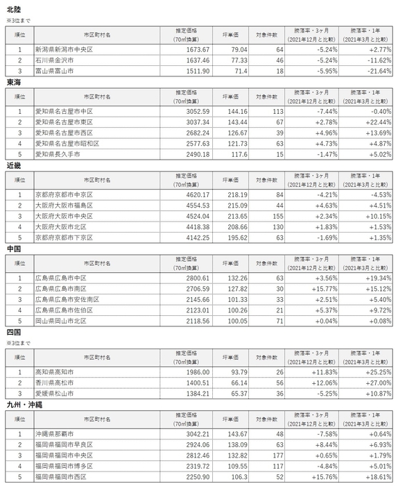 ・各エリアでの2022年3月の推定価格が1位の市区町村は以下の通り。