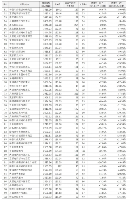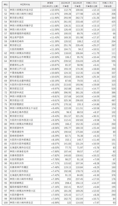 ・100位以内の市区で、前年(2021年3月)と比較して価格が上昇したのは92市区。また、3ヶ月前(2021年12月)と比較して価格が上昇したのは64市区。