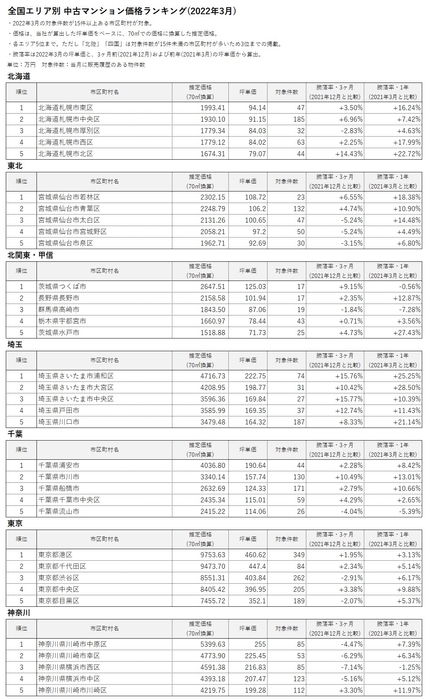 ■全国エリア別 中古マンション価格ランキング(2022年3月)