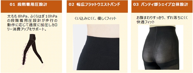本商品はグンゼオリジナルの段階着用圧設計で、歩行の動作に応じて適度に加圧して、カロリー消費アップをサポートします。レッグ部はマイクロファイバー素材を使用し、肌当たりがなめらかなはき心地を実現。パンティ部は立体設計でズリ落ちにくく、ウエスト部は幅を広くしてフラットにすることでくい込みにくくし、長時間はいても快適なこだわりの設計。用途にあわせて選べるように8分丈、10分丈をラインアップ。