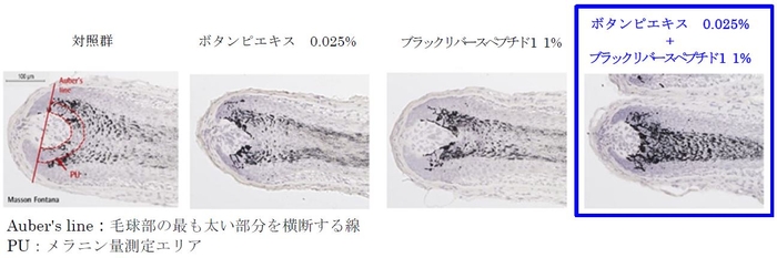 ヒト頭髪毛包器官培養系において、ボタンピエキス、ブラックリバースペプチド1及びそれらの組み合わせによる毛包内のメラニン量への影響を評価しました。その結果、ボタンピエキスとブラックリバースペプチド1の組み合わせにより、毛包におけるメラニン産生が有意に促進することが分かりました(図1)。