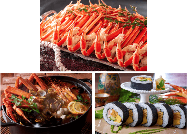 上段:しっかりと身が詰まったみずみずしいかにもバイキングで思う存分お楽しみいただけます。