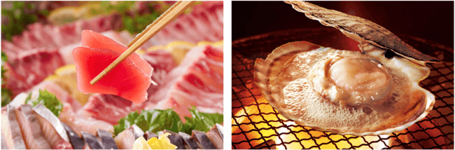 右:醤油の焦げた香りもご馳走の帆立の網焼き