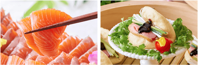右:中華料理のご馳走メニュー、北京ダックを挟んだ台湾式バーガー。しっとりしたダックとふわふわのパン、甜面醤ベースのソースがマッチした一品です。
