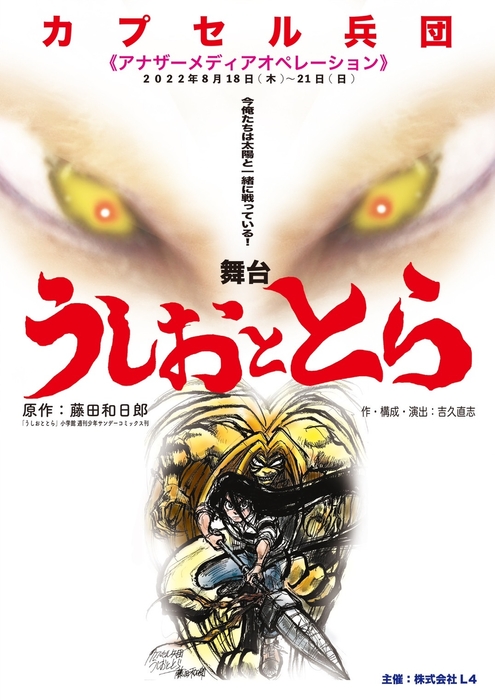 株式会社L4プロデュース カプセル兵団《アナザーメディアオペレーション》舞台『うしおととら』が2022年8月18日(木) ~ 8月21日(日)にシアターサンモール(東京都新宿区)にて上演されます。チケットはカンフェティ(運営:ロングランプランニング株式会社、東京都新宿区、代表取締役:榑松 ⼤剛)にて7月16日(土)より発売開始です。