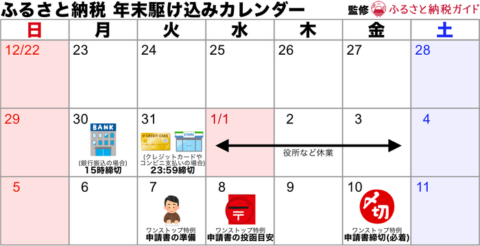 ふるさと納税の年末駆け込みカレンダーでは主に「寄付の締め切り」「ワンストップ特例の申請書の締め切り」について記載しています。