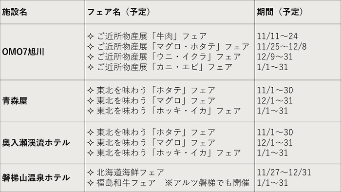 青森屋、奥入瀬渓流ホテル、磐梯山温泉ホテルでは、夕食ビュッフェのメニューがグレードアップします。お客様の目の前で調理するコーナーには、新鮮な海の幸を使用した海鮮丼や鉄板焼き、ステーキなどをご用意します。(*施設によりメニューは異なります。)また、アルツ磐梯では豪華なローストビーフ丼やイチゴをふんだんに使用したスイーツが登場。そのほか、ホテル近隣のディープな魅力を紹介しているOMO7旭川では、ホテルスタッフがおススメする店の特別メニューが並ぶ「ご近所物産展」の開催にくわえて、朝食ビュッフェでは、2大名物の「山わさび丼」「焼きたてワッフル」にスペシャルトッピングをご用意します。