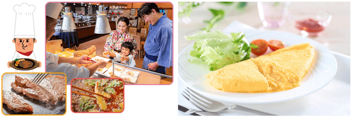 香ばしい香りと共に焼き上げられるステーキ*、パチパチと軽やかな音をたてて揚げられる熱々の天ぷらなどの他にも、朝食では焼きたてのオムレツやフレンチトーストを提供する宿もございます。