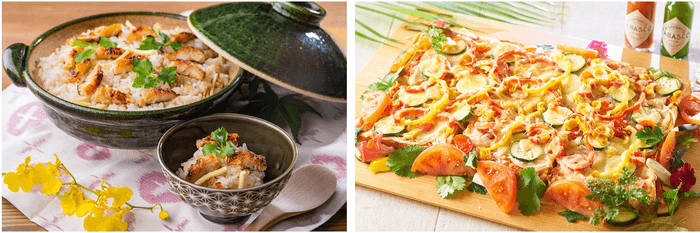 左:天草ホテル亀屋(熊本県)では「焼き鱧の炊き込みご飯」をご提供。仕上げに皮目に醤油を塗る「一杯醤油」という技法で香ばしく焼き上げた鱧に生姜の爽やかな辛みがアクセントの炊き込みご飯です。