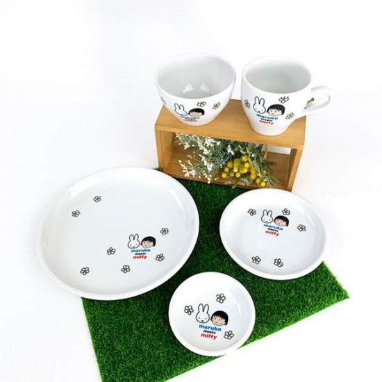 上の画像は、磁器製のテーブルウェアたち。白い磁器にミッフィー&まるちゃんのかわいいお顔がデザインされています。サイズ違いのプレートからマグカップまで、シリーズで揃えたいアイテムですね。