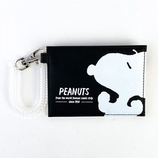 スヌーピーのシングルパスケースに、クールなブラックカラーが登場。デザインもシンプルなので、男女問わず使えます。薄くて携帯しやすいうえに、伸縮コード付きで便利です。