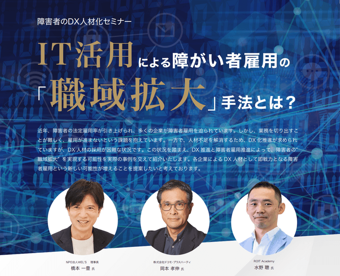 この度、障害者雇用支援事業の特定非営利活動法人WEL'S(代表理事:橋本 一豊、以下「WEL'S」)は、12月3日(火)16:00-築地にて、IT活用支援事業の株式会社ROIT及び株式会社NTTドコモの特例子会社である株式会社ドコモ・プラスハーティと3社合同で、障害者のDX人材化に関する説明会を開催します。この説明会は、これまで「障害者に頼める仕事が少ない」とされてきた社会認識を「障害者であってもDX人材として企業の即戦力となれる」という実例の紹介とその人材育成に関わる企業との連携した取り組みについてご紹介するもので、朝日新聞厚生業団との共催かつ、障害者雇用企業・就労系事業所向けのオンライン研修サービス事業の株式会社シエンシーの協賛により開催されます。