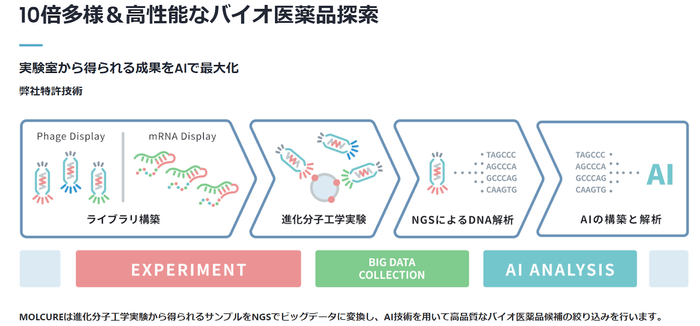 MOLCUREが提供するバイオ医薬品分子設計技術は、AIとロボットを活用して自動的に大規模スクリーニングと分子設計を行います。既存の手法と比較して、医薬品候補分子の発見サイクルを10分の1以下に効率化することや、10倍以上多くの新薬候補を発見すること、従来の手法では探索が困難な優れた性質を持つ分子を設計することが可能です。現在、本技術を活用し、製薬企業とパートナーシップを組んで新薬開発を行っています。