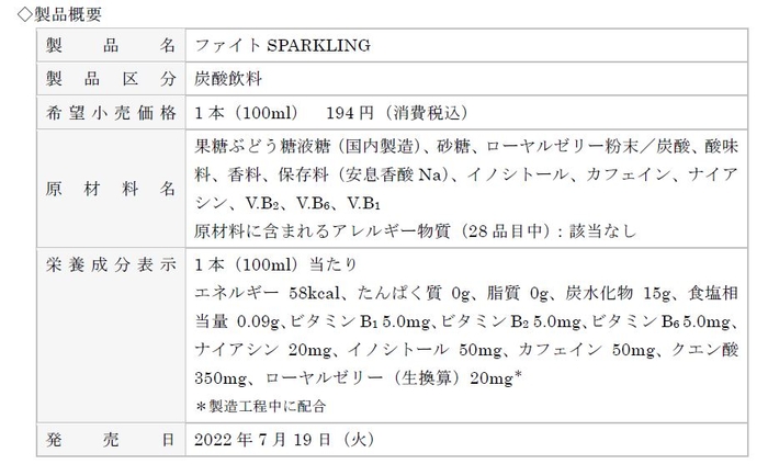 大正製薬株式会社[本社:東京都豊島区 社長:上原 茂]は、100mlアルミボトルの炭酸飲料「ファイトSPARKLING」を7月19日(火)に新発売いたします。