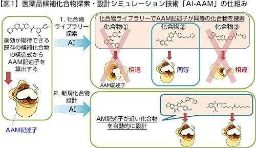 今回開発した「AI-AAM」は、タンパク質の構成要素であるアミノ酸(20種)と化合物の結合力を数値化することでタンパク質と化合物の結合力を予測できる独自の「アミノ酸マッピング(Amino-Acid Mapping, AAM)記述子」と、安定した構造を持つ化合物を新規設計する独自AI技術(*4)を組み合わせて、既存の医薬品候補化合物の構造式だけで新たな候補化合物を自動的に探索・設計できるシミュレーション技術です。「AI-AAM」は、既存の医薬品候補化合物の構造式から算出した「AAM記述子」をもとに、標的タンパク質との結合力がその化合物と同等で骨格が異なる新たな化合物を自動的に探索・設計することが可能。結果から原因を推定する逆問題解法を採用しているため、化合物ライブラリーから骨格の異なる化合物を探索するだけではなく、従来発想できなかった骨格を持つ化合物を新たに設計することができます。さらに、疾患ごとに異なる標的タンパク質の立体構造やAIに学ばせる膨大な実験データが不要であり、既存の医薬品候補化合物の構造式に「AI-AAM」を適用するだけで、新たな化合物を探索・設計できるため、高い利便性と汎用性を実現しています。