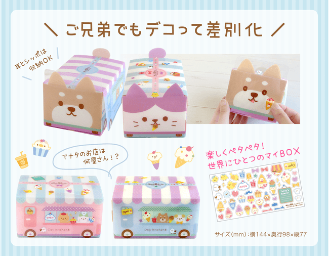 イヌとネコのかわいいケースはキッチンカー。スタンプを立てて使いやすくなった上に、オリジナルのイラスト入りネーム印がプラス。