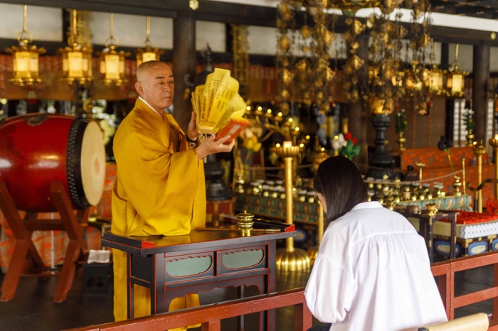 御祈願の場所は、弘法大師のかつての住まいであり、1,200年間毎日法要を執り行う場でもある国宝「御影堂(みえどう)」です。申込の際に参加者から伝える願い事とともに、災厄や邪気が寄ってこないよう、僧侶がお祈りする法要を執り行います。御祈願を受け、気持ちを新たにして、1年を過ごせます。
