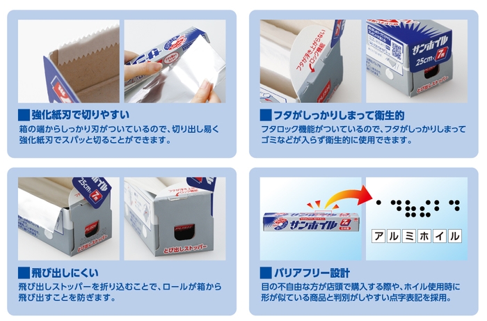 衛生的で、引き出しやすく・切りやすい新しい「パッケージ」を新採用‼ サンホイルは「生活者の使いやすさ」を追求し、お客様の声をもとに改良改善を継続しております。