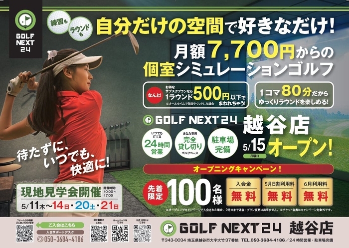 不動産の所有、売買、管理などを行うワイム総合企画株式会社(東京都新宿区、代表取締役 佐藤 直史)は、昨年12月にオープンし、3ヶ月で400名の会員を獲得し大盛況を博している地域密着型の個室シミュレーションゴルフ施設【GOLF NEXT 24】相模原・橋本店・所沢店に続き、5月15日に埼玉県越谷市に全6室のAIGIA設置店舗をオープン。4店舗目となる。